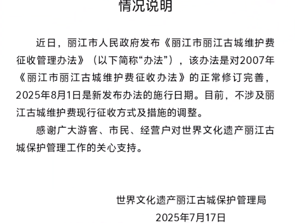 午后,丽江古城的青石板路被晒得发烫,游客王女士攥着手机导航穿梭在人流中。在黑龙潭公园入口,她被工作人员拦下:“请补缴50元古城维护费。”王女士愣住了:“古城里没人提这事啊!”她的困惑,正是丽江古城维护费新政下百万游客的缩影。
